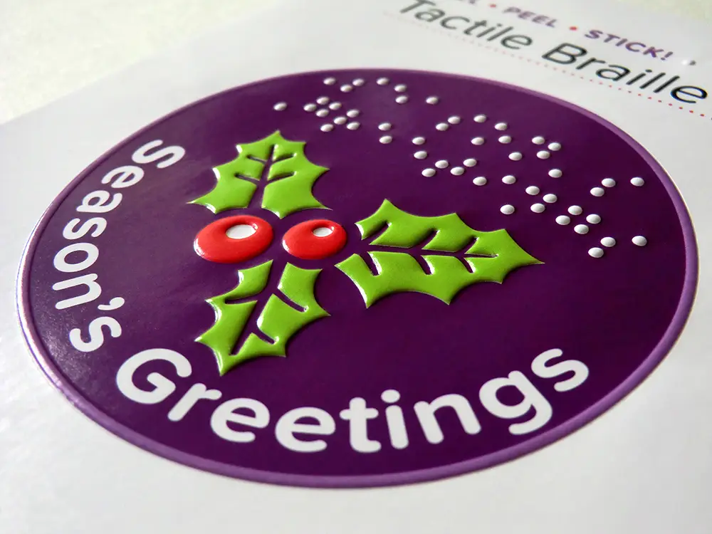 Six colourful tactile Christmas stickers in braille and print with embossed illustrations. Young and old can enjoy using these stickers on Christmas cards or to decorate presents.
