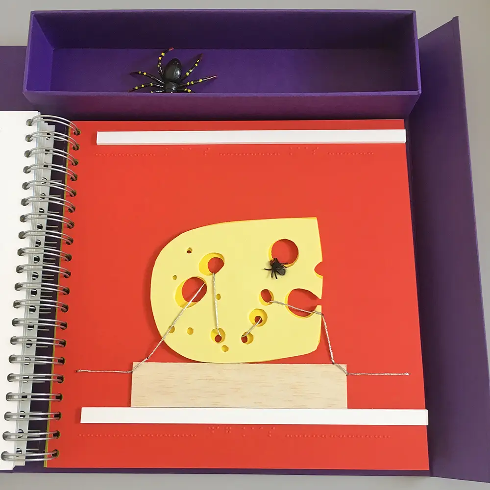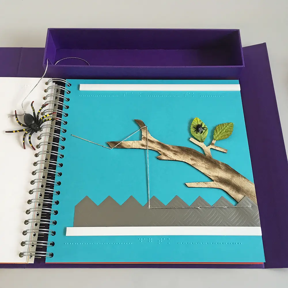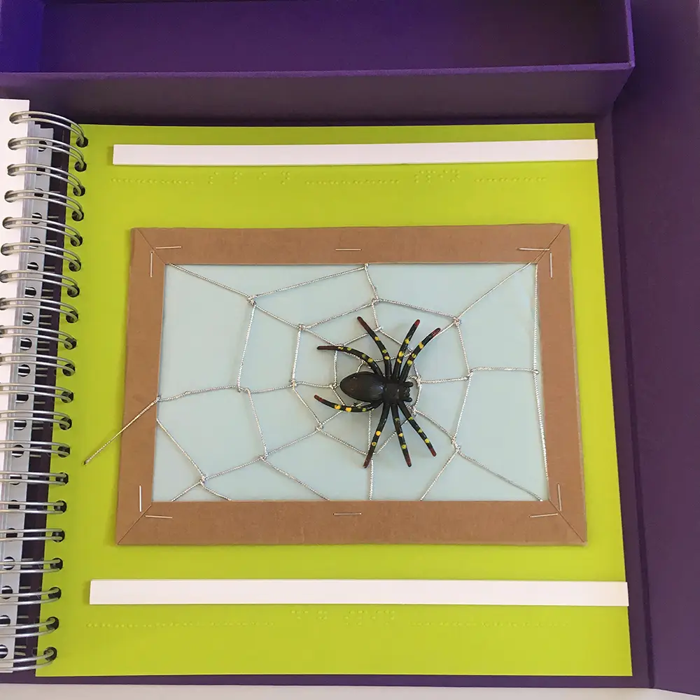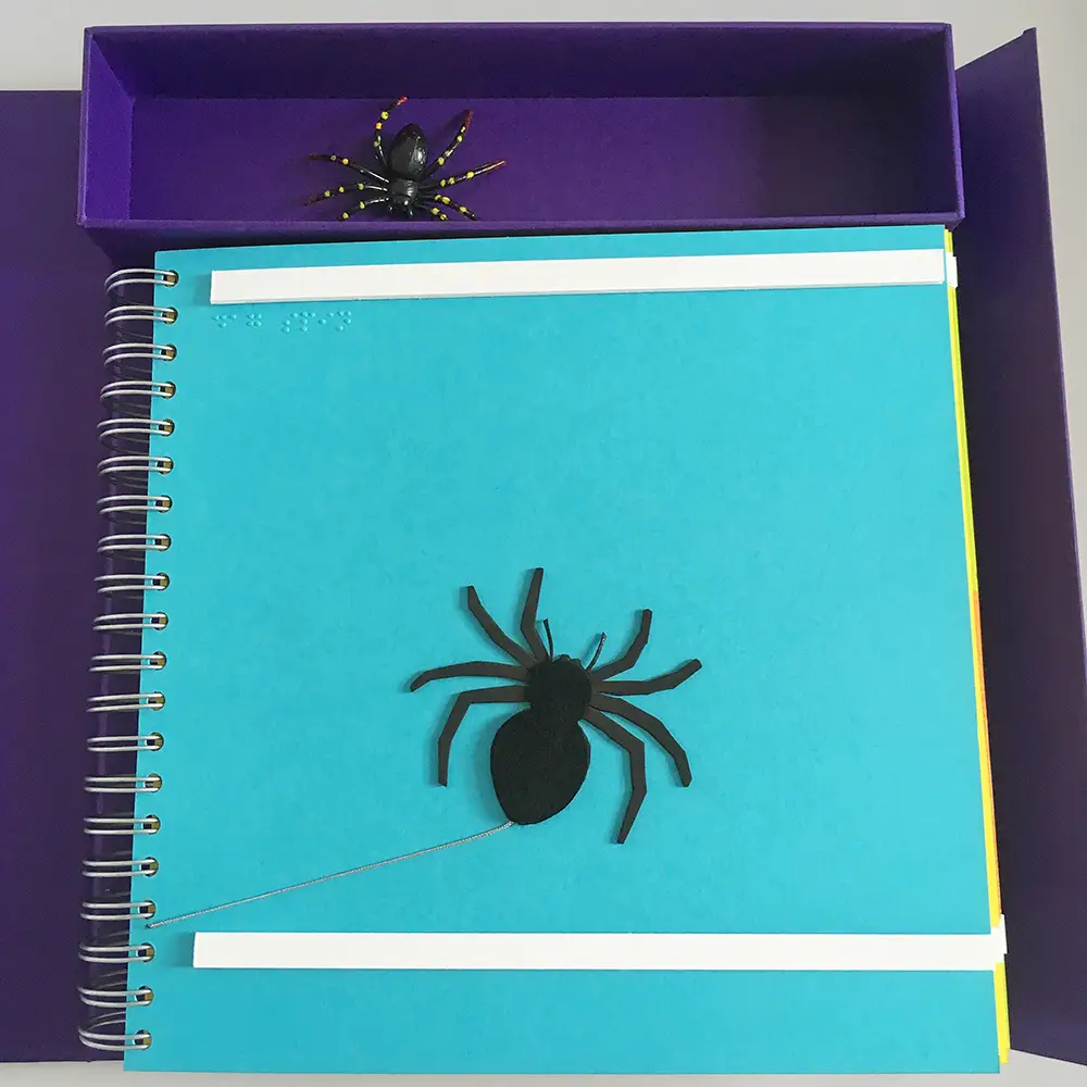 The book can be opened and closed using a side flap, indicated with tactile material (spiders web).