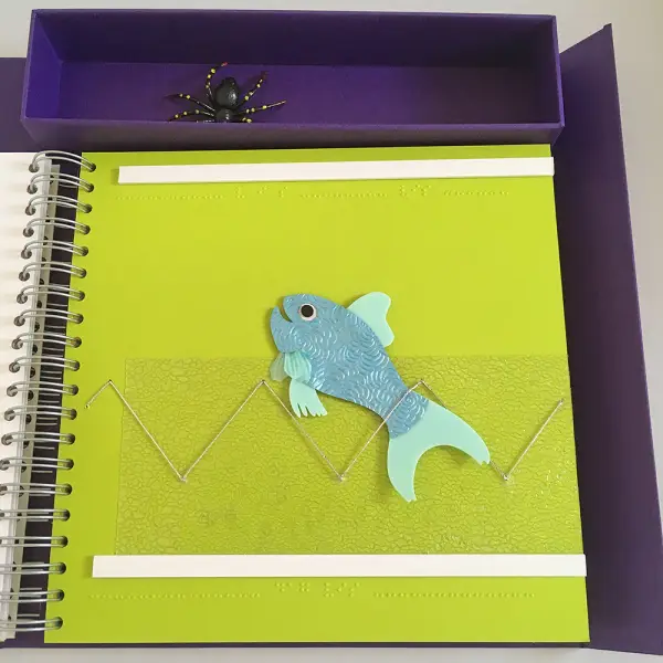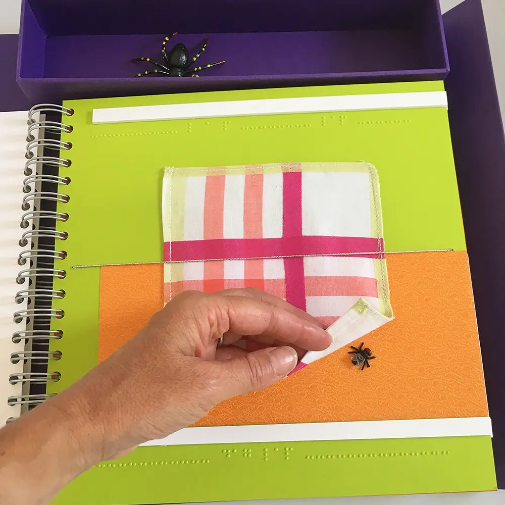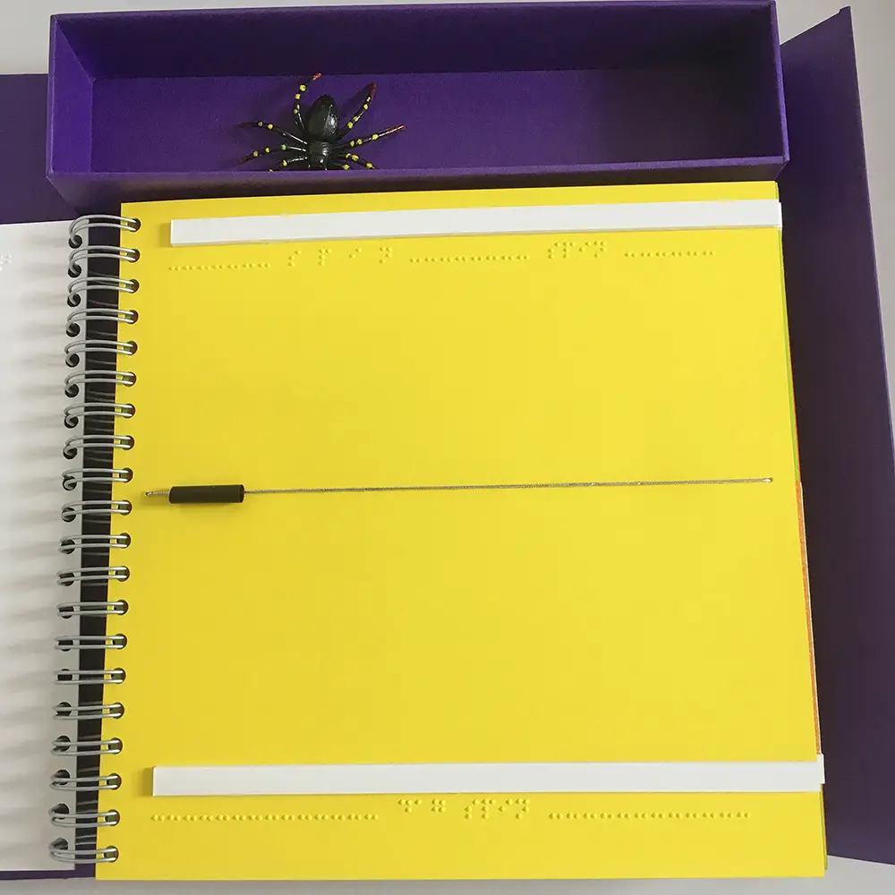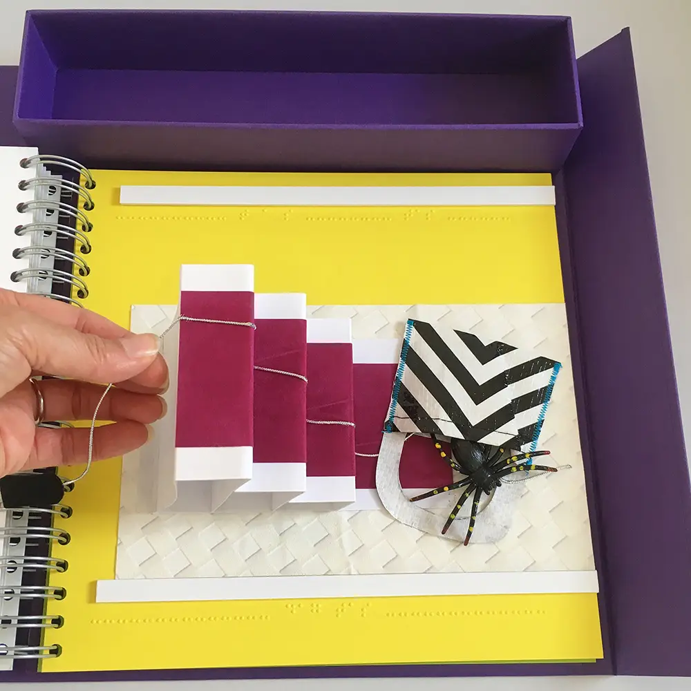 The book can be opened and closed using a side flap, indicated with tactile material (spiders web).