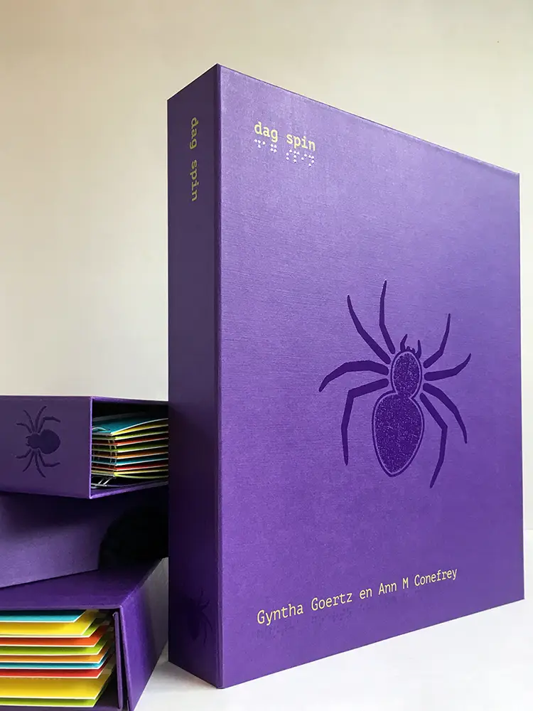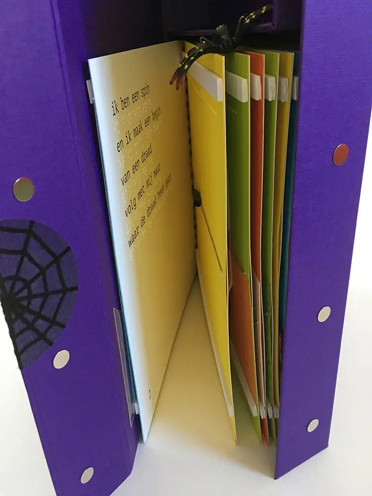 ‘Dag Spin’ tells the story of a spider, journeying past various objects until it finally settles to build its web. The story unfolds on spreads: the lefthand pages carrying the story in braille and print and the righthand pages enriching the story with tactile illustrations. Above and below each illustration a word and a simple sentence in braille have been added for children who are not yet able to read the whole story. Thick strips have been placed above the braille to encourage correct use of the fingers. The strips also help to protect the braille on the lefthand pages from being rubbed by the illustrations. Each book comes with a model spider which the child can use to act out the story. Not only do children have a lot of fun doing this but it also helps them understand (abstract) concepts. It is a positive and inclusive reading experience which stimulates literacy skills for children learning braille and also their sighted classmates.
