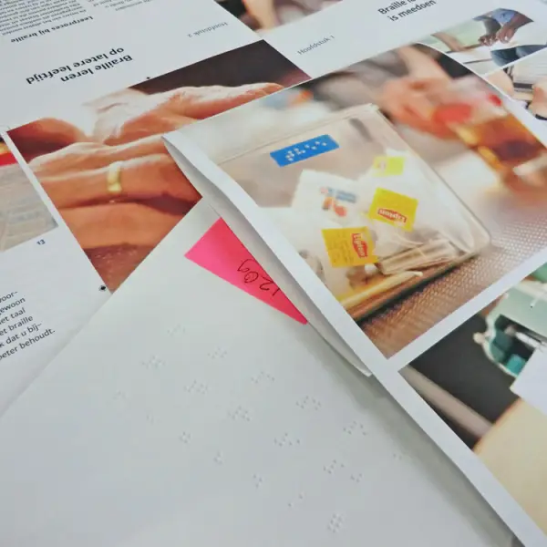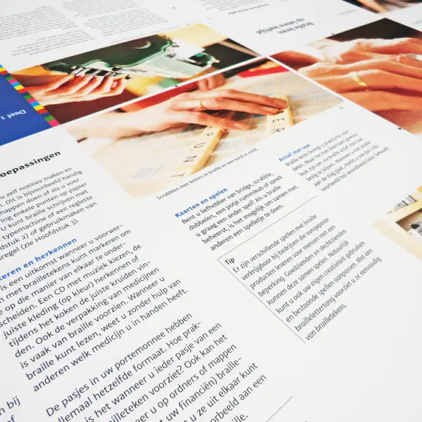 Three members of the Braille Education Group are blind and to make sure that everyone was fully involved during the project I made different kinds of proofs. For example the design proofs were accessible through separate text versions, including descriptions of the design elements and photography. Using mockups I was able to make the form tangible and the braille examples were of course presented in braille.