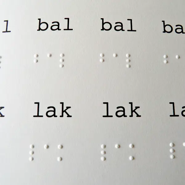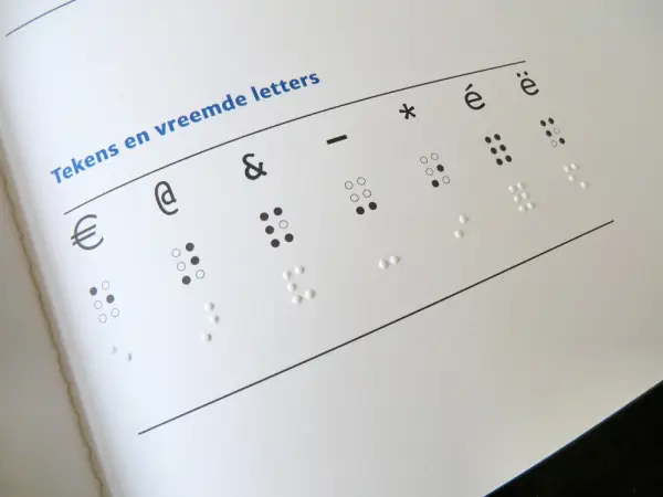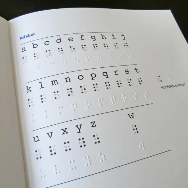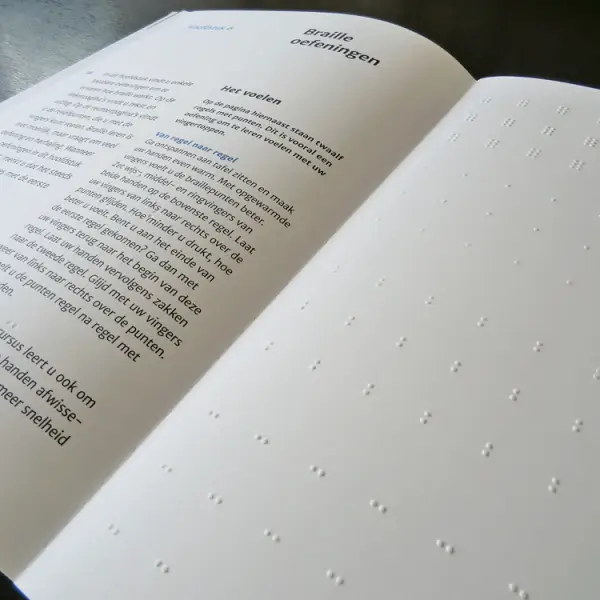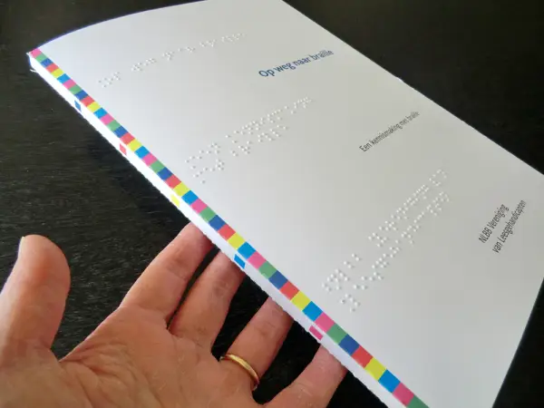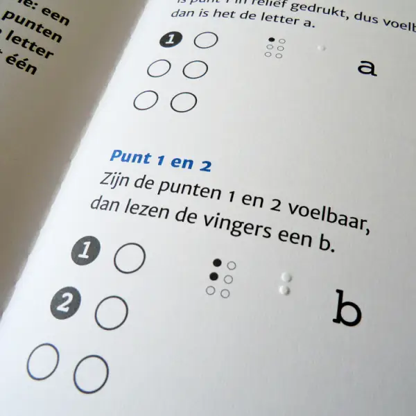 Developing a book about braille, an introduction for those with (very) low vision, placed special demands on the design and production. I thought carefully about the structure, legibility, use of color, the braille examples, the overall design and the materials used. Furthermore, because I wanted to integrate braille printing with offset, and in a hand-bound form, additional steps were necessary during the production process.