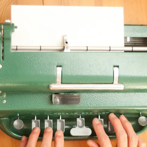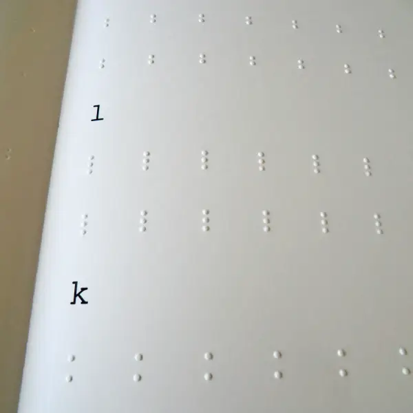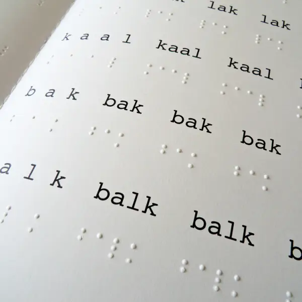 As a second typeface I used Courier. This is a monospaced typeface, designed by Howard “Bud” Kettler, which I’ve also used for other NLBB projects, partly because of the interesting relationship with a braille typewriter. I’ve used the Courier in a functional way, that is above the braille and in exactly the same size. In this way the reader can follow the braille letter for letter and at the same time get an idea of how big braille is (this is in relation to the fingertips) and how wide it runs.