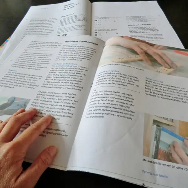 The initial content was outlined by the group. A communications consultant then refined and developed the information further. For the second part of the book, the content and design were developed simultaneously and as such go hand in hand. Following all the preliminary proofs, a colour mockup was presented to several external institutions representing/working with people with visual disabilities. They came back with some constructive remarks and proposed interesting additions, which strengthened the quality of the content and design.