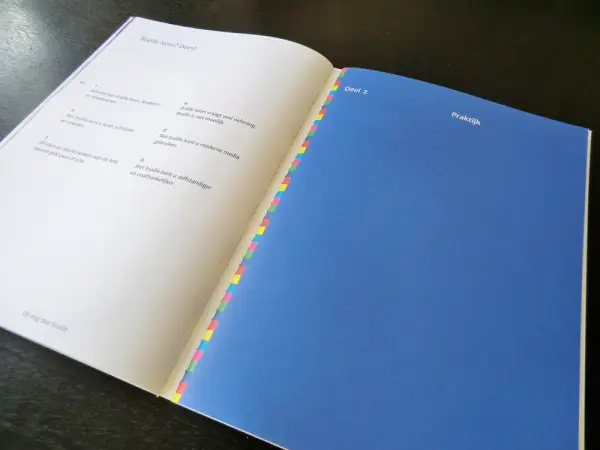 For the opening pages of Part 1 and 2, I used a solid area of blue to mark the start of these sections. When open, the book lies so flat that if Part 2 had been white this would barely have been distinguishable from the back flap. On these opening pages and on the cover I used a strip of colour blocks, a series of repetitions of six blocks (reference to braille), which I’ve used in other designs for the NLBB. These colour blocks not only give a subtle accent but are also directly related to the positioning of printed text and braille (top, middle, bottom).