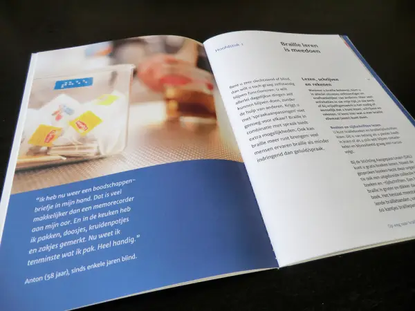 The use of photography in the book has several functions: aesthetic and informative. It shows the use of braille in different situations, sometimes in combination with a quote. As a series they work well: atmospheric with an interesting interplay between sharp and blurred, lots of details of fingers reading braille. The use of closeups, without ‘visual clutter’, accommodates various eye disorders and is a subtle way of making associations with different age groups and backgrounds, without being able to recognise those who were photographed.