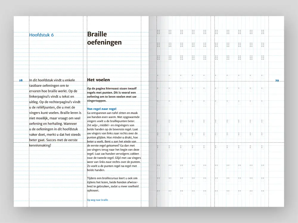 The underlying references to braille form the basis for the design. I used the principle of braille for the page grid and layout, that is to say two vertical and three horizontal rows, together forming six fixed positions: top, middle, bottom and left, right. These so-called ‘braille cells’ are applied in a rigid manner within a fixed grid. This is found in the basic layout using two columns for text, and in the use of three vertical areas for the positioning of typography and the photography.