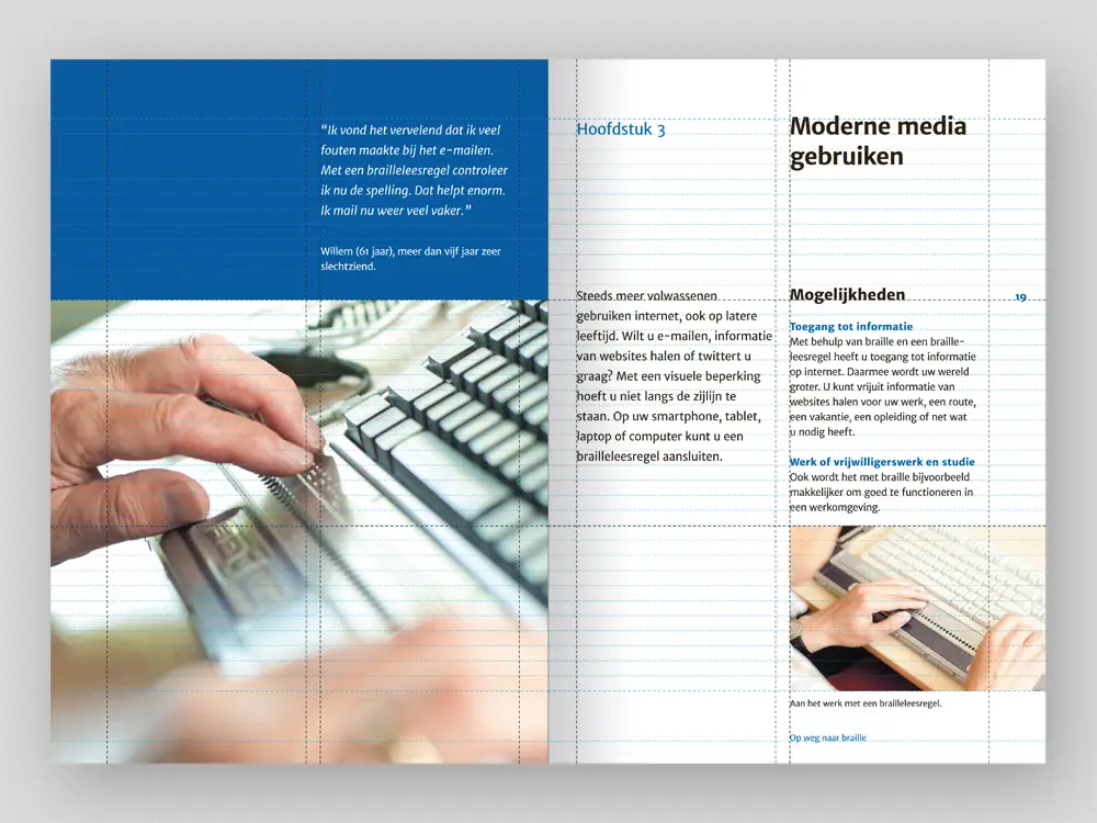 I accompanied the photographer for all the photoshoots, offering support and advice. Afterwards, in consultation with a braille expert, I selected the best photos. It was important that they were technically accurate, showing the correct use of the fingers when reading braille. As part of the design all the photos have fixed positions on the page grid, just like braille itself.