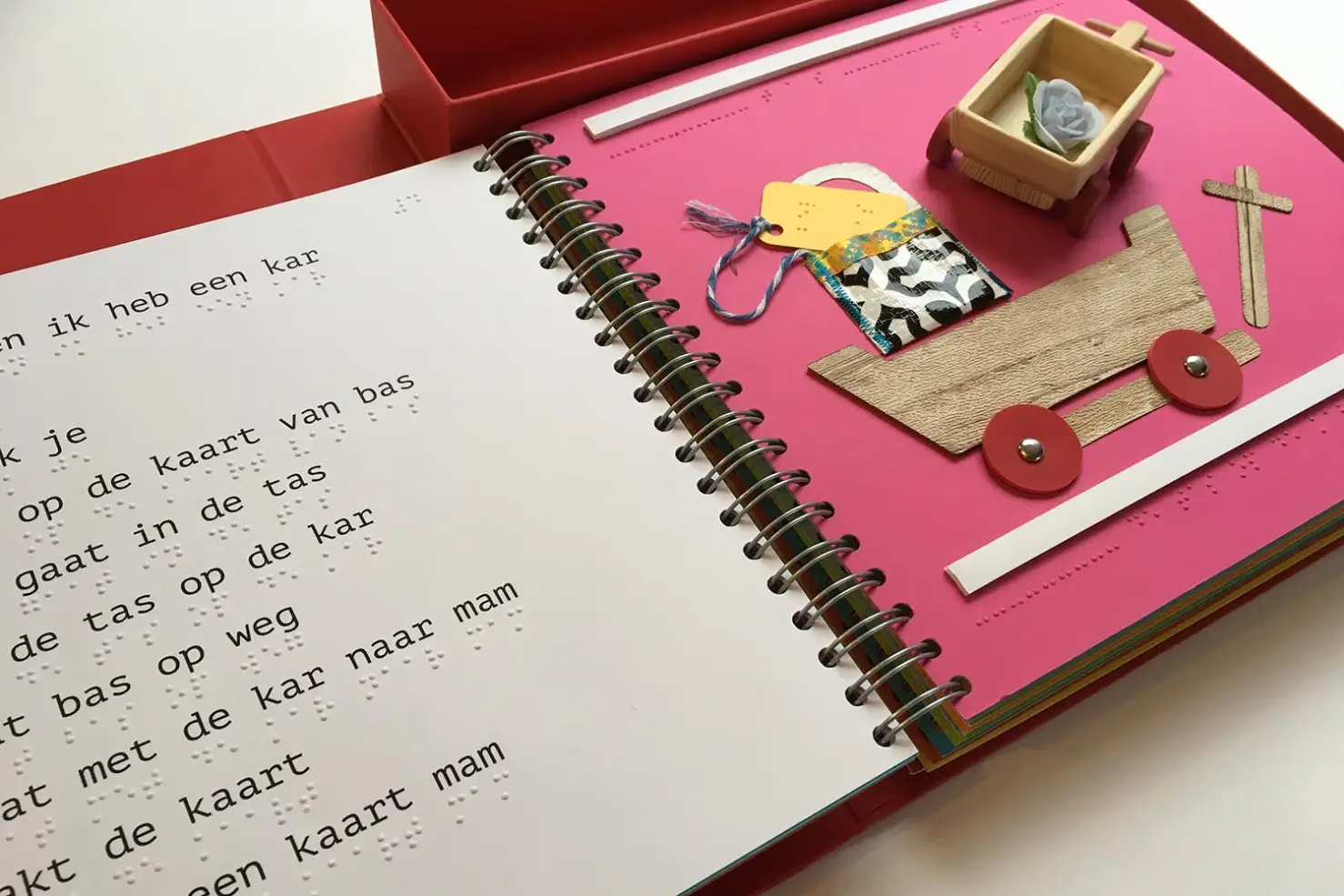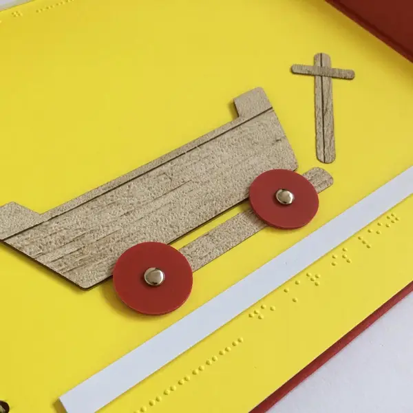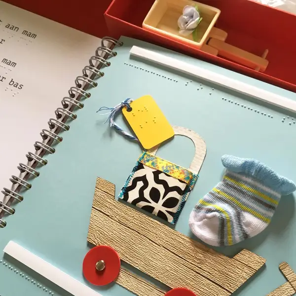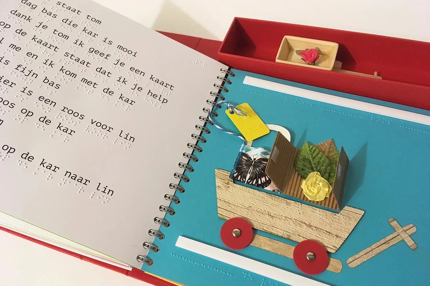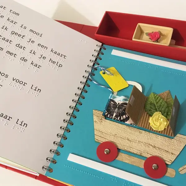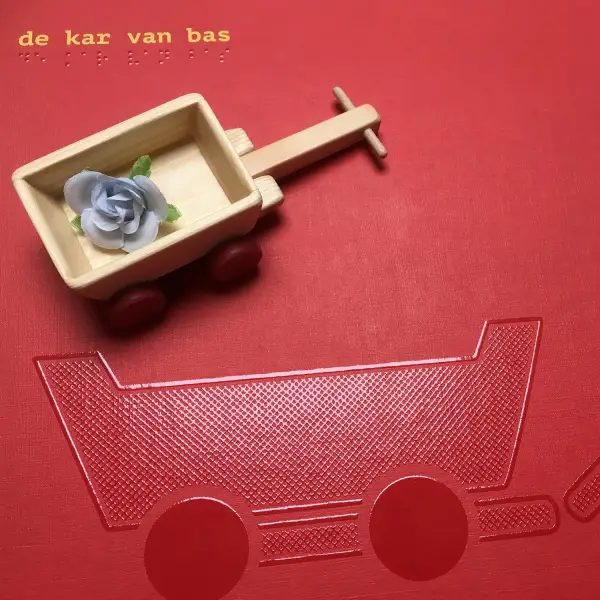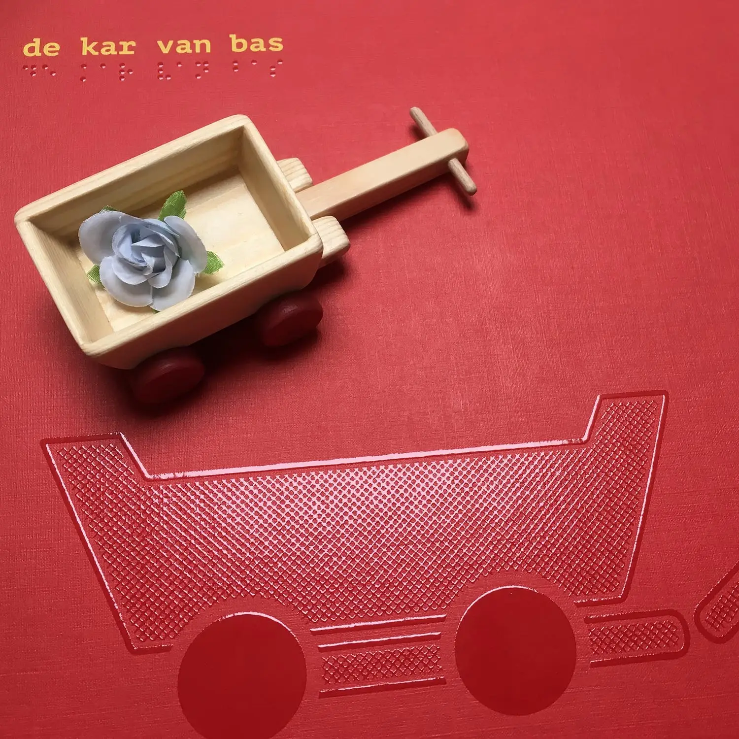 This is a slightly more complex story with lots of details for children who are further with learning braille. A boy called Bas makes a wooden cart which he then uses to run little errands: taking a sock to his uncle, returning a lost cat, delivering a rose, etc.