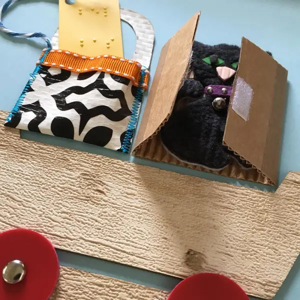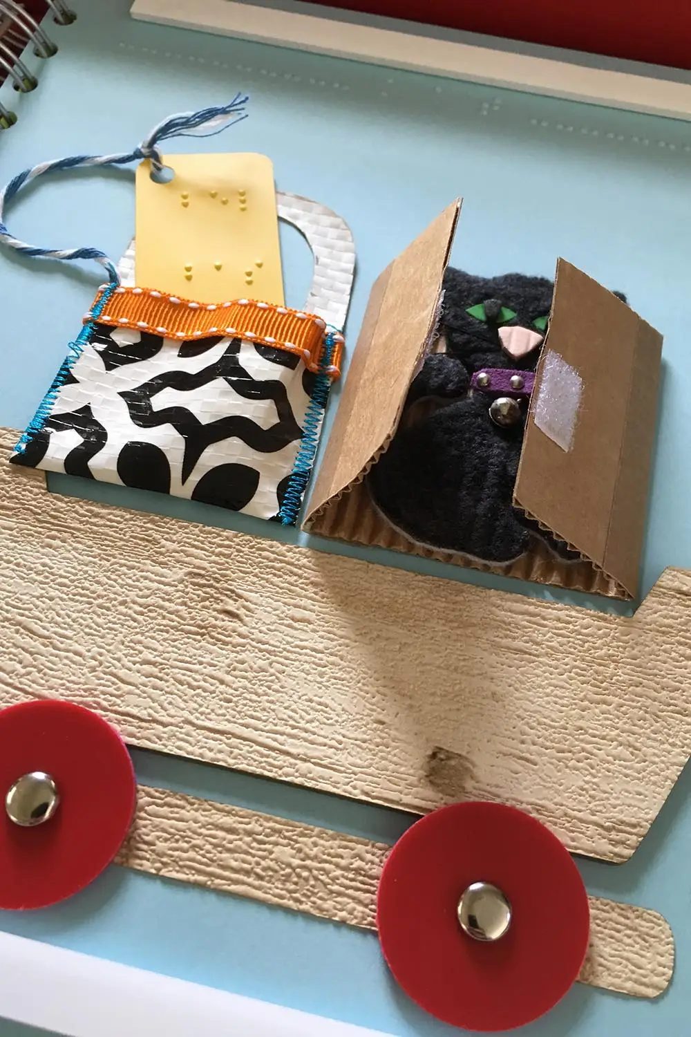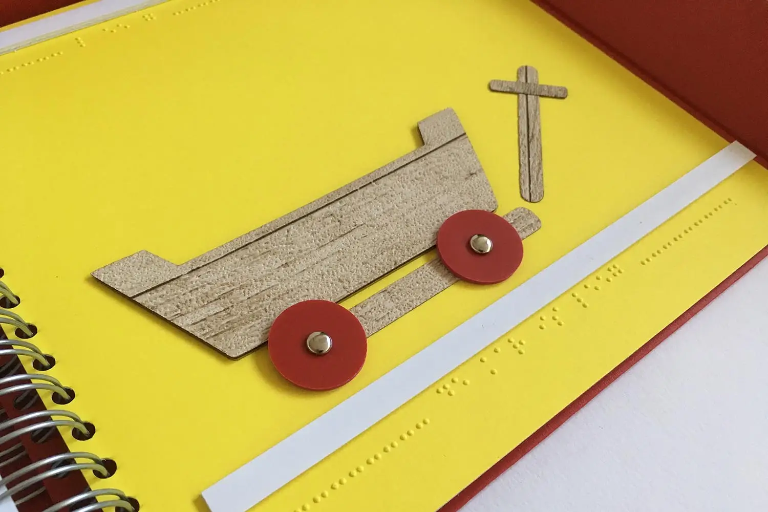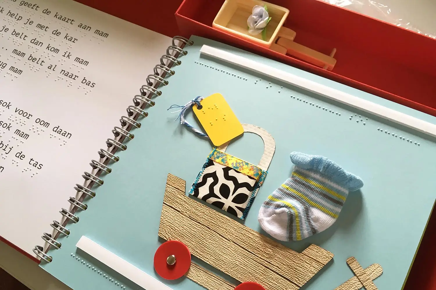 This is a slightly more complex story with lots of details for children who are further with learning braille. A boy called Bas makes a wooden cart which he then uses to run little errands: taking a sock to his uncle, returning a lost cat, delivering a rose, etc.