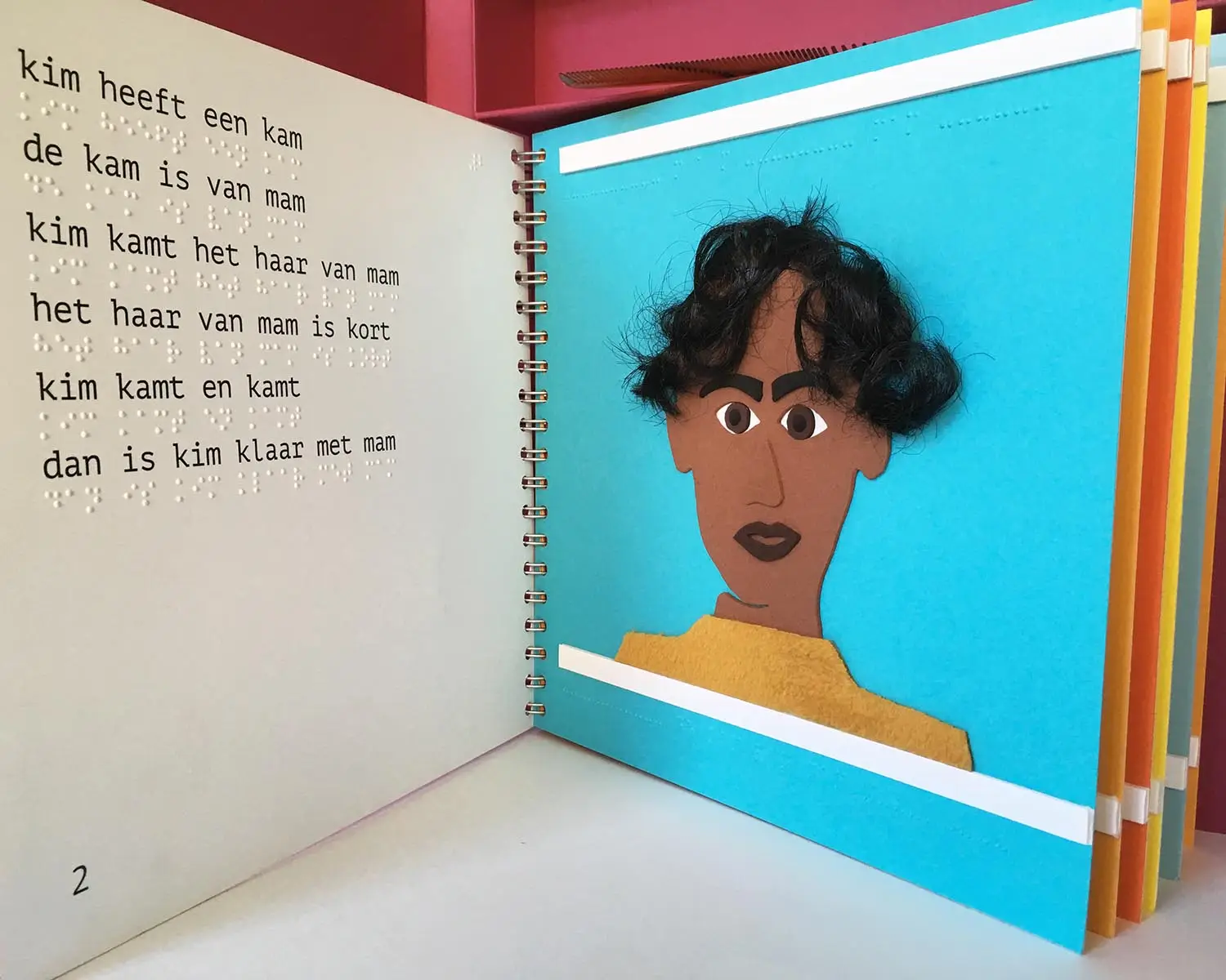 Once again, a cleverly crafted story using some of the very first words which a child will learn in braille. Another lively story, this time about a little girl Kim, eager to use her comb. In fact so eager that she explores the boundaries of what she can and cannot comb, for instance her father’s bald head, the goldfish, even the hen. Finally she settles down with her doll, happily combing its hair.