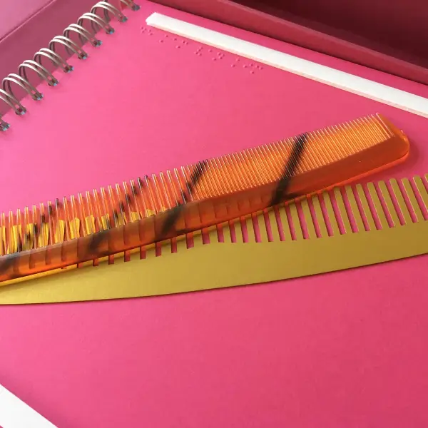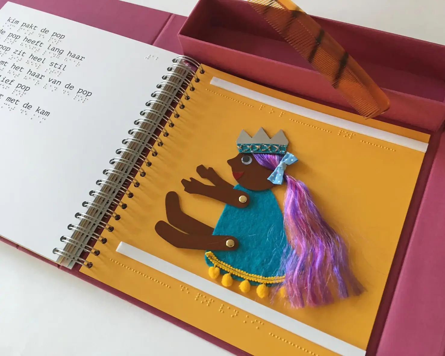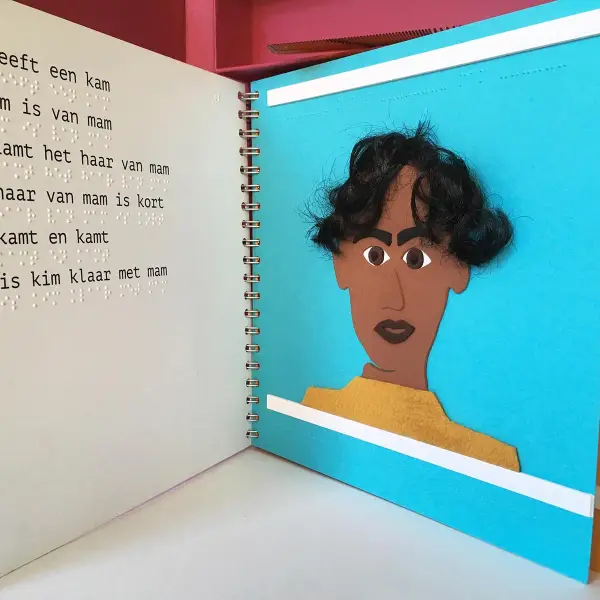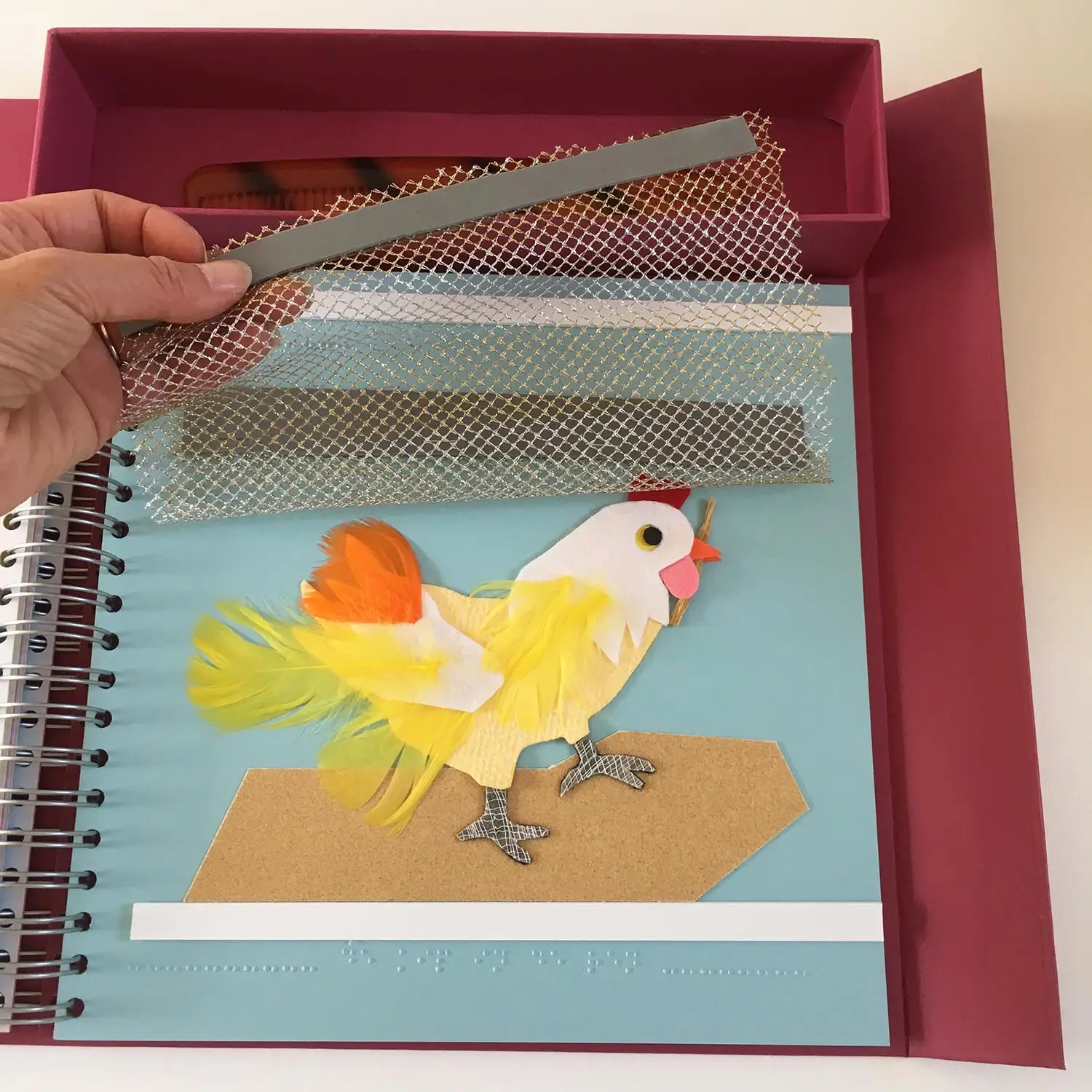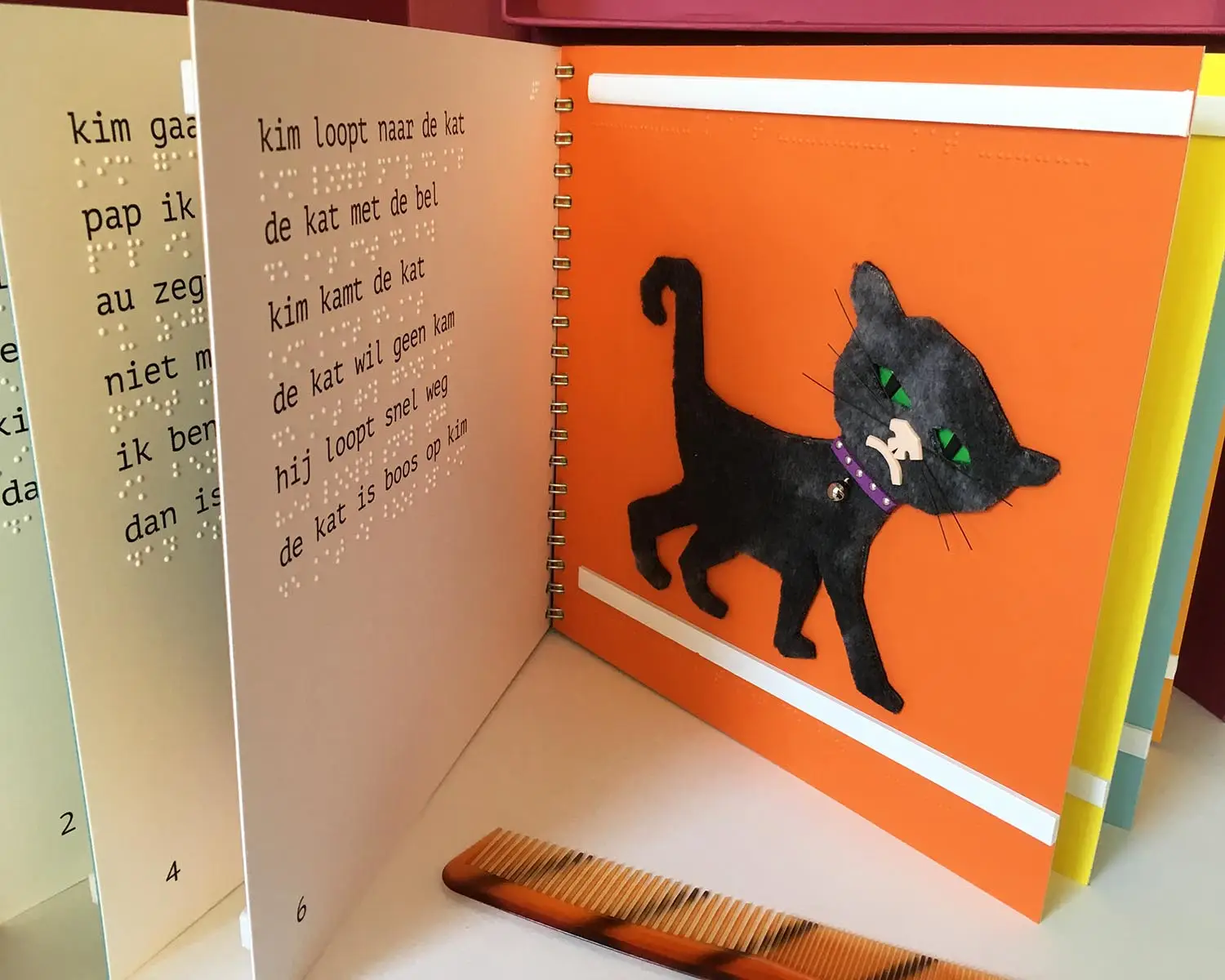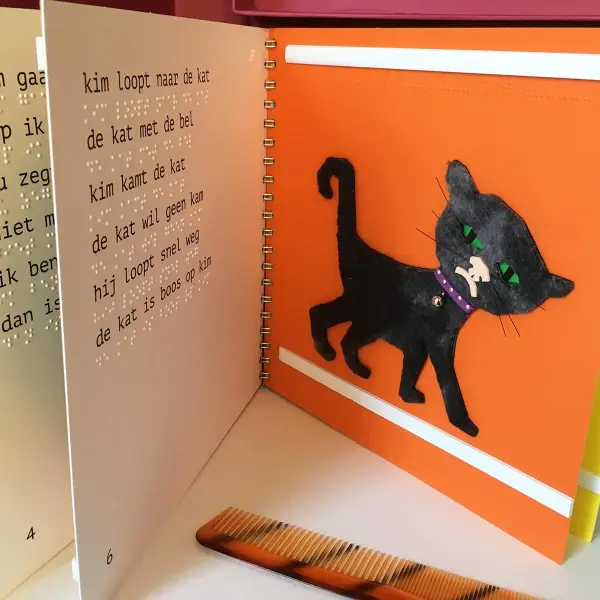 On the cover, there is a tactile line drawing of a comb in exactly the same shape and size as the real comb which has been added to each book. By placing the real comb on top of the illustration the children learn about the relationship between 3D objects and 2D tactile drawings; this is an early introduction to important concepts. Once again, children are encouraged to interact with the story as a means to gain greater understanding of language and the world around them. With guidance they can use the comb to brush the illustrations (and anything else they come across). Its a funny story, very appealing to young children learning to read their first words in braille. On a more serious level it also teaches children about behaviour and emotions; what is or isn’t acceptable and why.