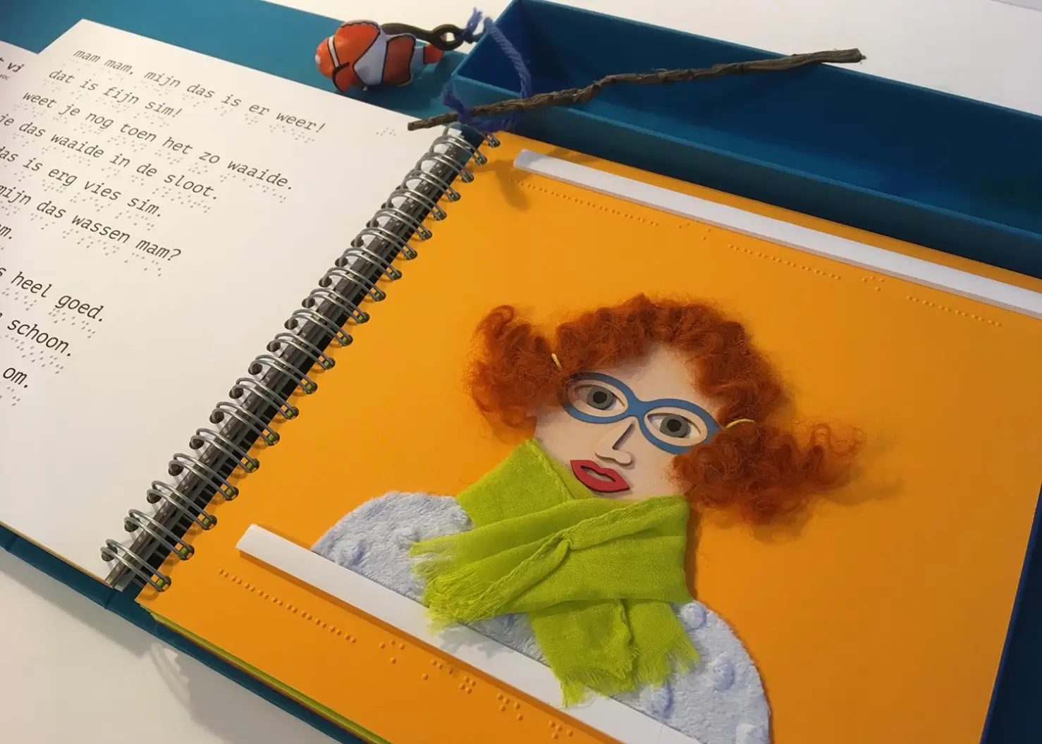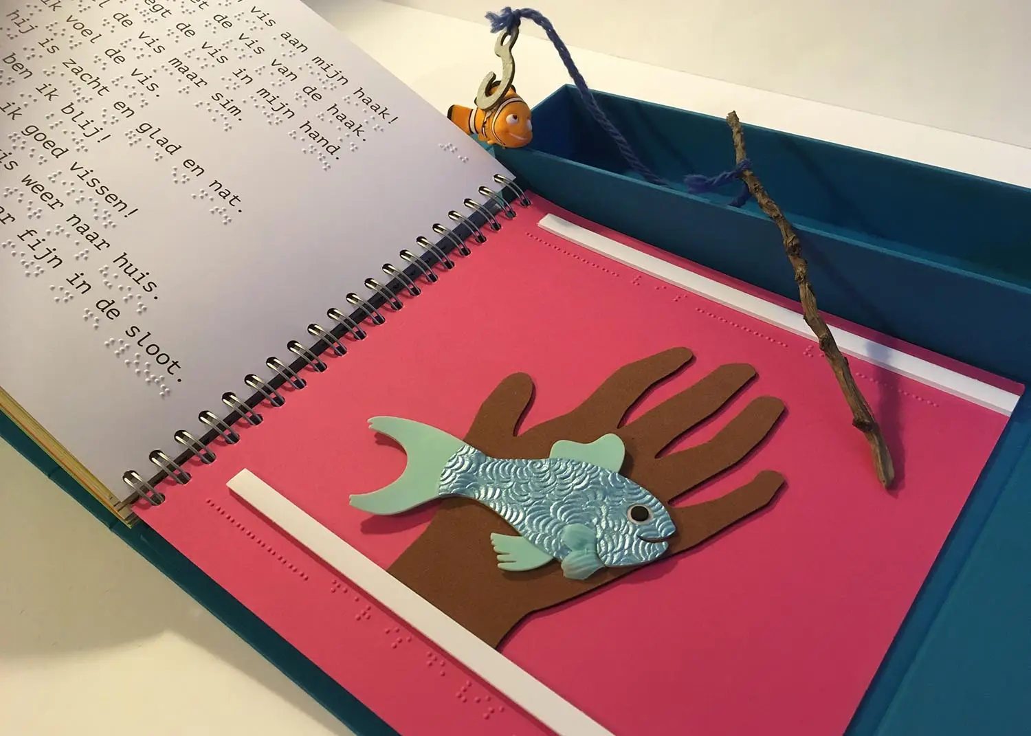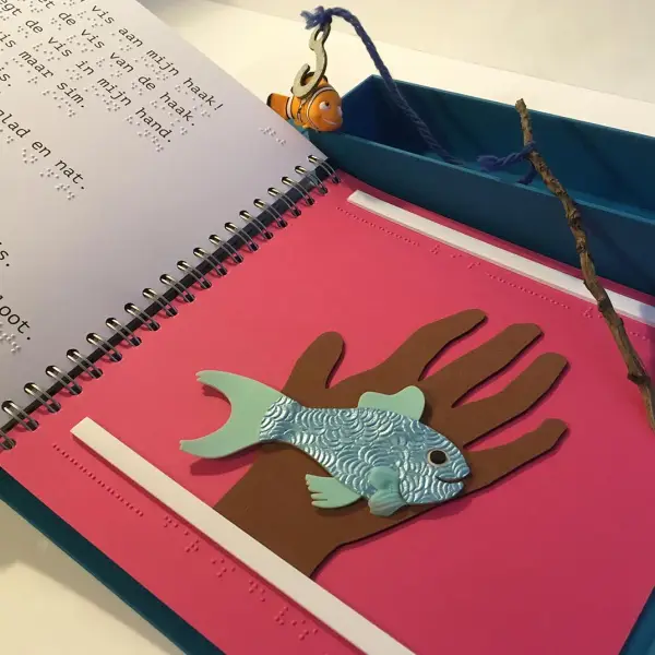 As with the book about Bas and his cart, there is a lot of repetion used in the story which advances in small steps. Certain elements are repeated consequently in the illustrations making these easy to recognise and interpret. The book comes with a handmade fishing rod and 3D fish. Using the rod, children are encouraged to act out parts of the story and so gain better understanding of certain concepts and language as a whole.