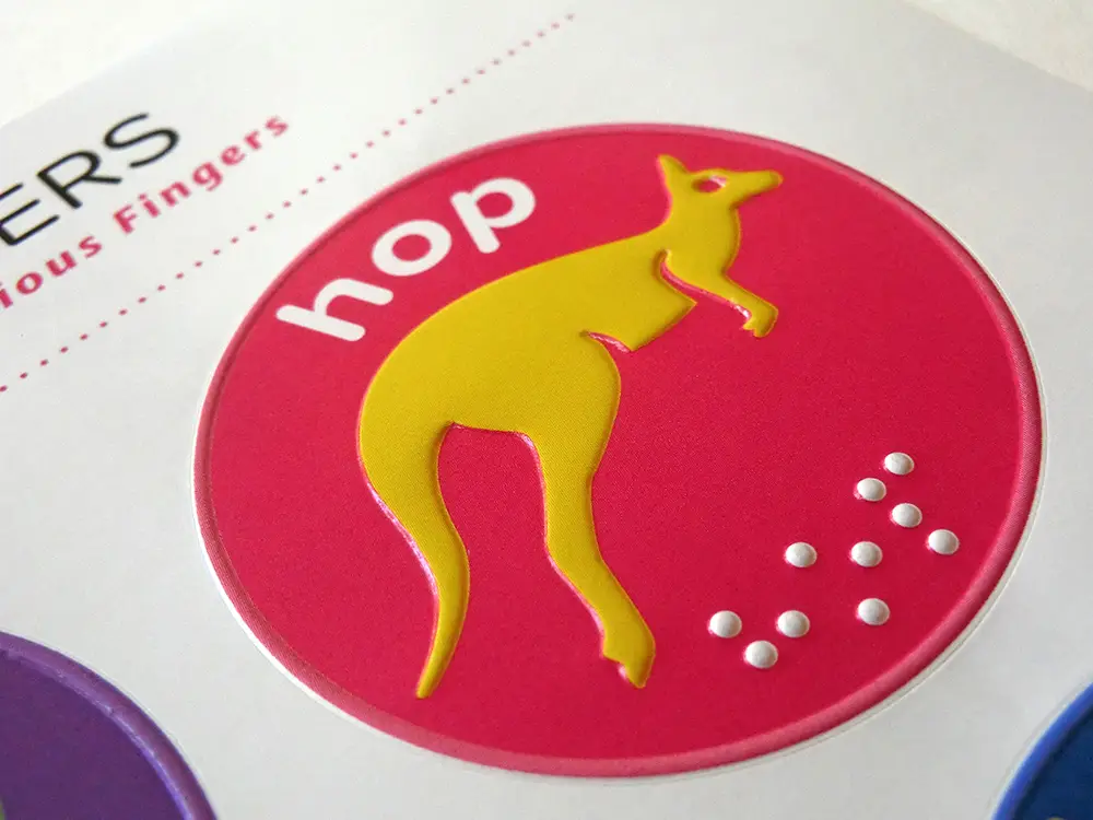 ‘Hop’ in large print and braille; stylized drawing of a kangaroo in relief.