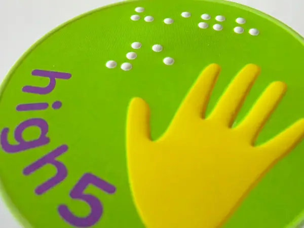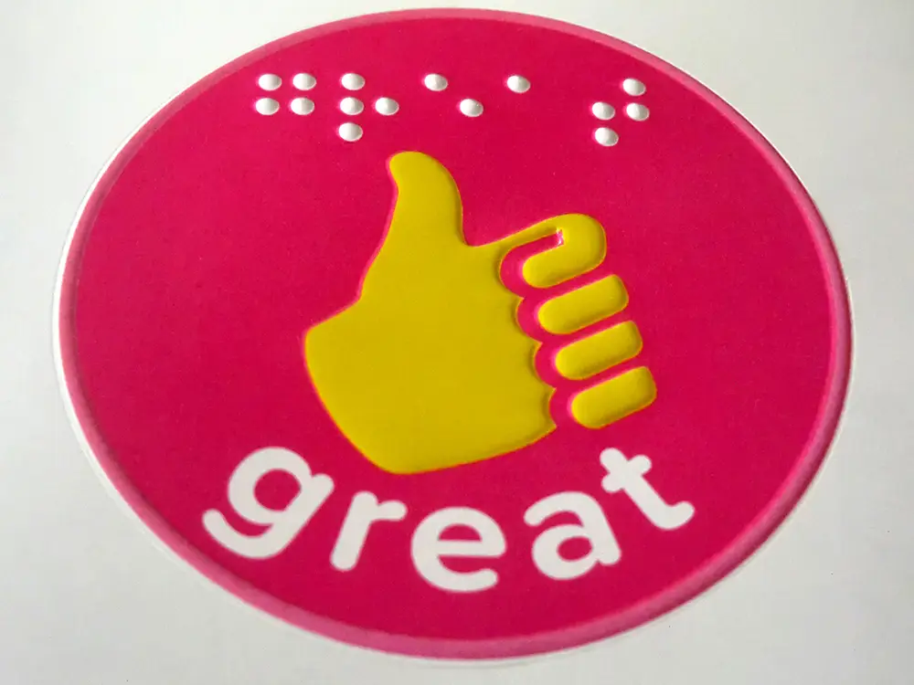 ‘Great’ in large print and braille, along with a tactile thumbs up.
