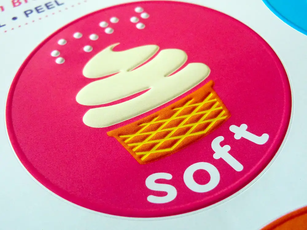 ‘Soft’ in large print and braille; stylized ice cream in a tactile cone.