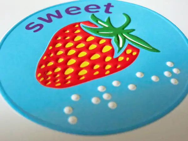 ‘Sweet’ in large print and braille; embossed strawberry.