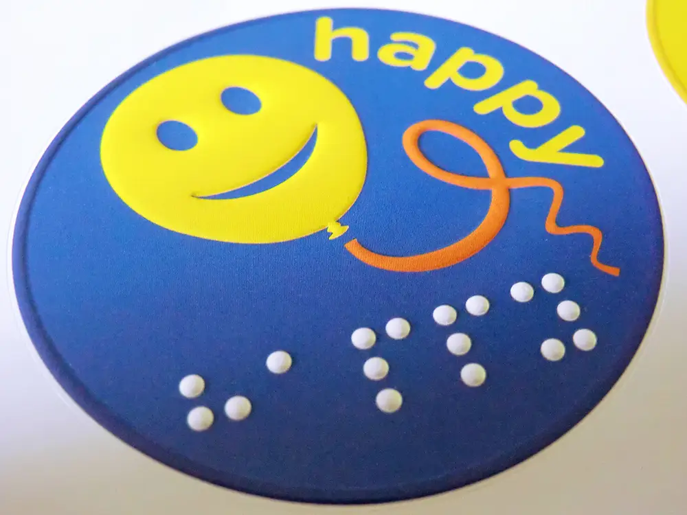 ‘Happy’ in large print and braille, along with an embossed drawing of a balloon with a smiley face.