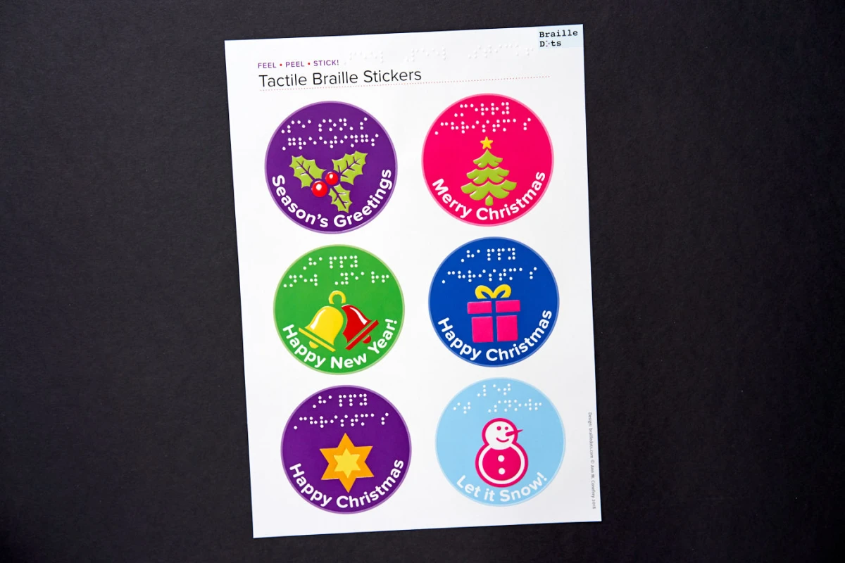 Spread some Christmas cheer on your cards and presents with 6 unique Christmas stickers, each carrying a festive message in braille and large print together with a brightly coloured tactile illustration.